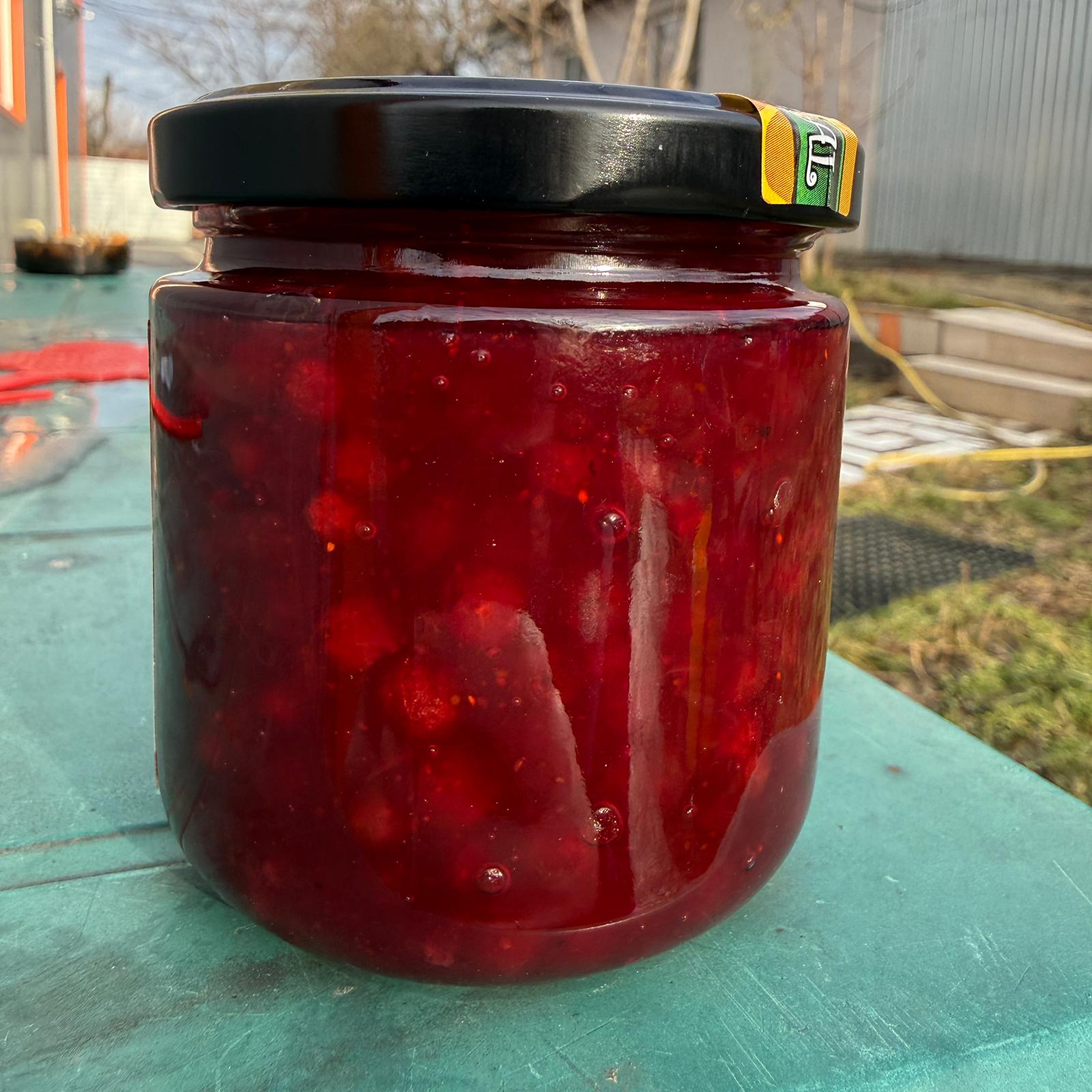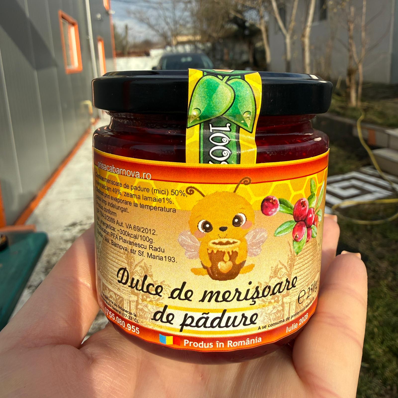 Dulceață de merișoare cu miere — un amestec rafinat între gustul acrișor al merișoarelor sălbatice și dulceața caldă, florală a mierii. Culoare: roșu-intens, ușor translucid, cu mici semne ale fructelor întregi. Aromă: note proaspete, ușor tăioase de fructe de pădure, completate de un parfum blând și caramelizat de miere. Gust: început acrișor, urmat de o dulceață echilibrată, fără a fi înclinat spre zahărul rafinat; textură ușor gelatinoasă, cu bucăți moi de merișoare care oferă consistență.